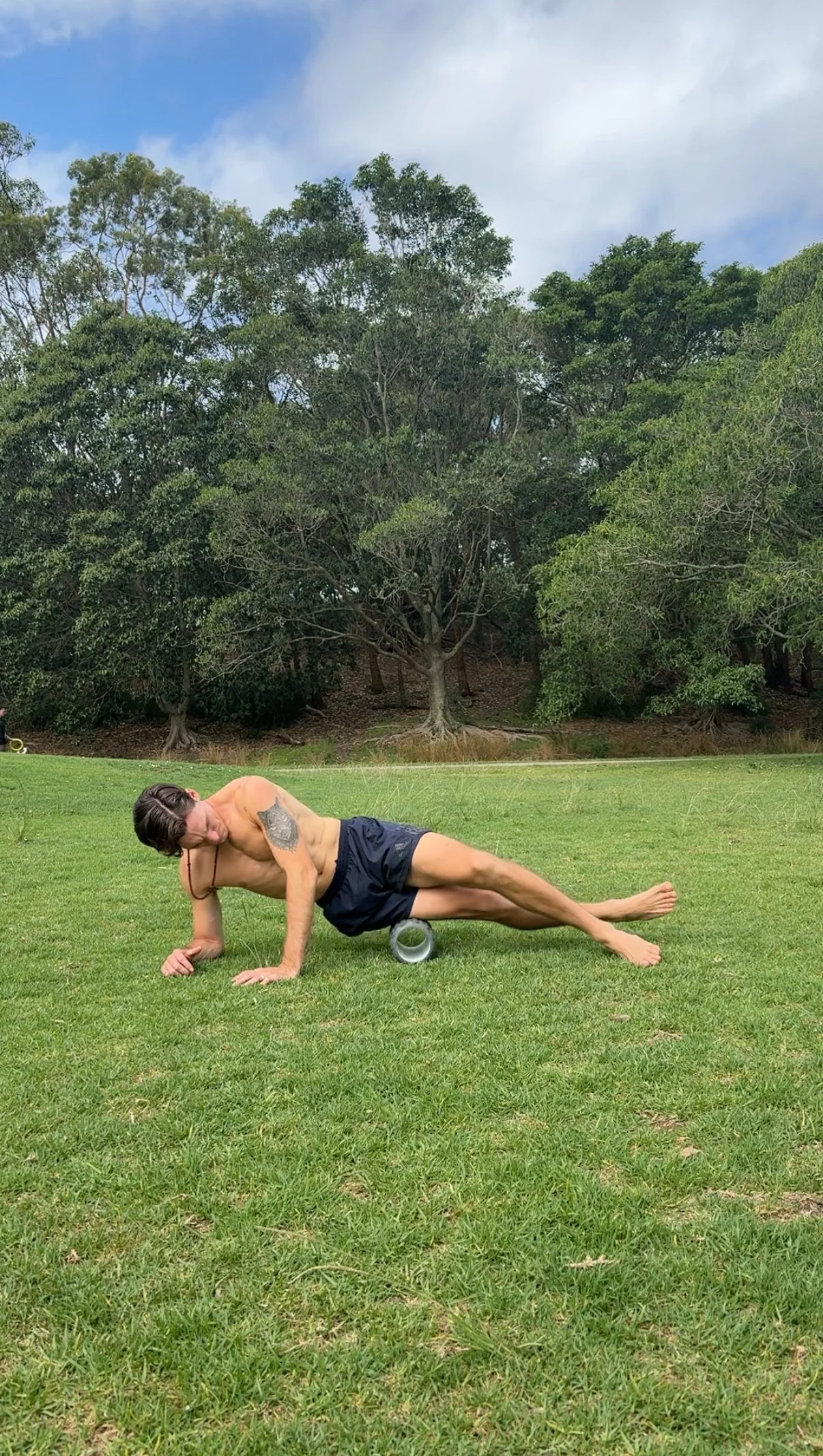 Performing myofascial release on the iliotibial band of my right leg.